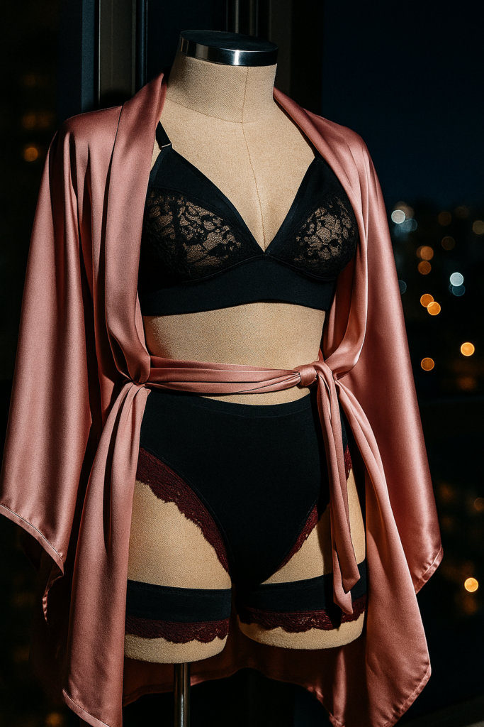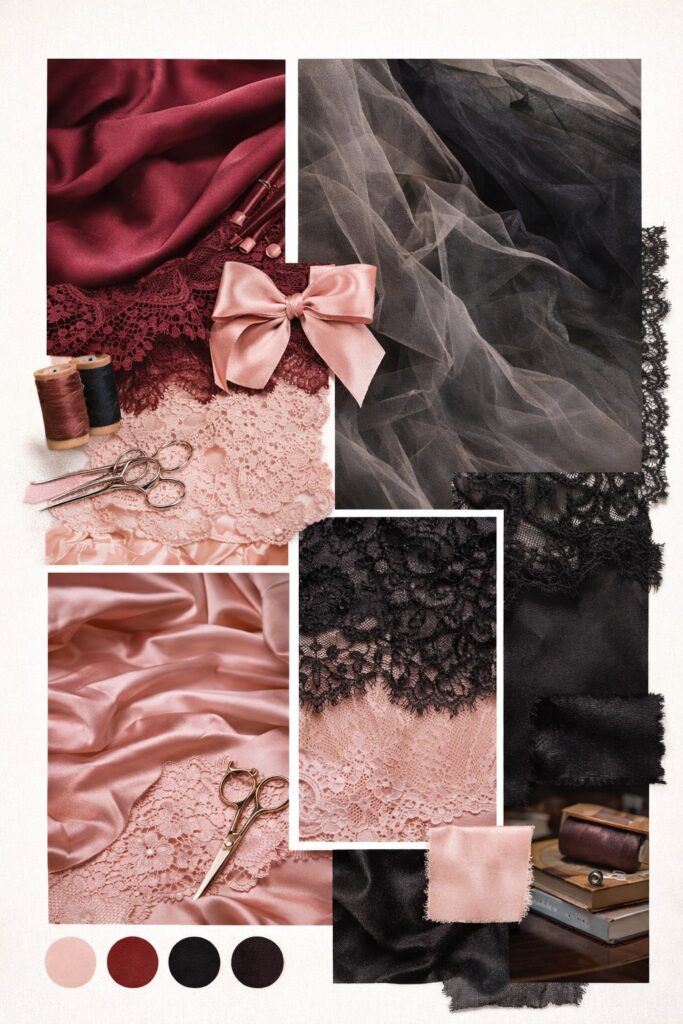 The use of black lace, sheer tulle, and intense tones like burgundy and pink creates a visual atmosphere that blends seduction with tension. Garter belts, sheer
